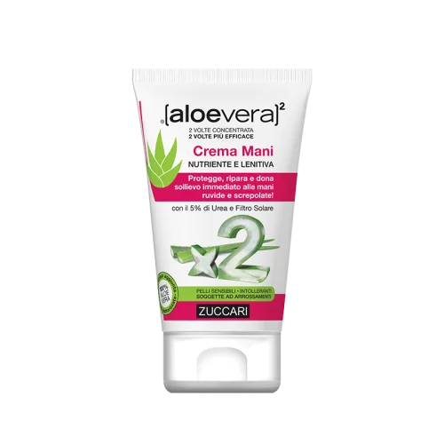 Aloevera 2 Crema Mani è un trattamento dermocosmetico che sfrutta l'azione idratante e nutriente del succo di Aloe vera 100% pura e doppiamente concentrata, per offrire sollievo in caso di mani secche e screpolate da agenti atmosferici come freddo e vento.