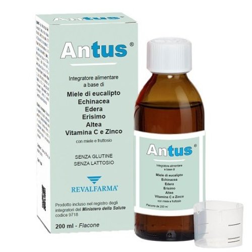 La formulazione di Revalfarma Antus include i seguenti ingredienti: acqua demineralizzata, miele di eucalipto, fruttosio, altea (Althaea officinalis L., maltodestrina) radix e.s. E/D 1:4, echinacea [Echinacea purpurea (L.) Moench, maltodestrina] herba e.s. tit. 4% in polifenoli, acerola (Malpighia glabra L., maltodestrina) fructus e.s. tit. 50% in vitamina C, edera (Hedera helix L., maltodestrina) folium e.s. tit. 1% in ederagenina, erisimo [Sisymbrium officinale (L.) Scop., maltodestrina] summitas cum floribus e.s. E/D 1:4, zinco gluconato; conservante: potassio sorbato; aroma; addensante: gomma di xantano; correttore di acidità: acido citrico. Il prodotto è privo di glutine e lattosio.