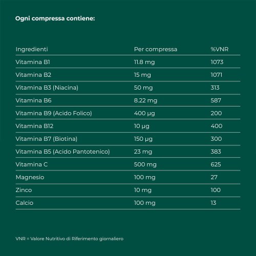 Integratore alimentare di vitamine del gruppo B, vitamina C, calcio, magnesio e zinco,utile a colmare le carenze o gli aumentati fabbisogni organici dei nutrienti in essocontenuti.