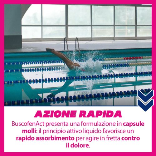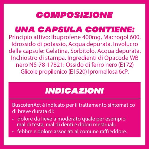 In qualità di antinfiammatorio non steroideo è particolarmente indicato per il trattamento di dolori mestruali, mal di testa, mal di denti e stati febbrili. La sua formulazione in capsule gel, oltre a favorire il rapido assorbimento dell’ibuprofene e il suo veloce ingresso in circolo, facilita l’assunzione stessa del farmaco e lo rende particolarmente pratico per l’uso. BuscofenAct è indicato negli adulti e negli adolescenti con peso corporeo superiore a 40 kg (di età pari o superiore a 12 anni).