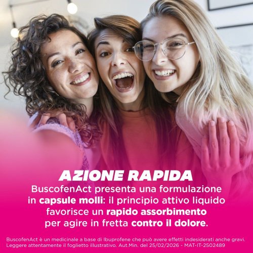 In qualità di antinfiammatorio non steroideo è particolarmente indicato per il trattamento di dolori mestruali, mal di testa, mal di denti e stati febbrili. La sua formulazione in capsule gel, oltre a favorire il rapido assorbimento dell’ibuprofene e il suo veloce ingresso in circolo, facilita l’assunzione stessa del farmaco e lo rende particolarmente pratico per l’uso. BuscofenAct è indicato negli adulti e negli adolescenti con peso corporeo superiore a 40 kg (di età pari o superiore a 12 anni).