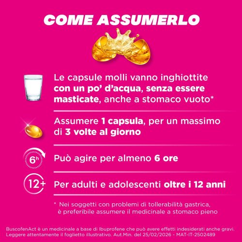 Posologia Adulti e adolescenti con peso corporeo > 40 kg (di età pari o superiore a 12 anni): dose iniziale di 400 mg di ibuprofene. Se necessario, può essere assunta un’ulteriore dose da 400 mg di ibuprofene.L’intervallo tra una dose e l’altra deve essere stabilito in base ai sintomi osservati e alla massima dose giornaliera raccomandata, e non deve essere inferiore a 6 ore. Non assumere più di 1200 mg di ibuprofene nelle 24 ore. Soltanto per trattamenti di breve durata. Gli effetti indesiderati possono essere minimizzati con l’uso della dose minima efficace per la durata di trattamento più breve possibile necessaria per controllare i sintomi (vedere paragrafo 4.4). Se BuscofenAct capsule molli deve essere assunto negli adulti per più di 3 giorni in caso di febbre o per più di 4 giorni per il trattamento del dolore o se i sintomi peggiorano, si consiglia al paziente di consultare il medico. Si raccomanda l’assunzione a stomaco pieno alle persone con disturbi gastrici. Se assunto poco dopo aver mangiato, l’insorgenza dell’effetto di BuscofenAct può essere ritardata. Se questo accade non prenda BuscofenAct più di quanto raccomandato nel paragrafo 4.2 (posologia) o fino a quando sia trascorso il corretto intervallo tra una dose e l’altra. Particolari popolazioni di pazienti Anziani Non sono richieste particolari modifiche del dosaggio. A causa dei possibili effetti indesiderati (vedere paragrafo 4.4), i soggetti anziani devono essere attentamente monitorati. Insufficienza renale Nei pazienti con danno della funzione renale lieve o moderato non sono richieste particolari modifiche della dose (per i pazienti con insufficienza renale grave, vedere paragrafo 4.3). Insufficienza epatica (vedere paragrafo 5.2) Nei pazienti con danno della funzione epatica lieve o moderato non sono richieste particolari modifiche della dose (per i pazienti con disfunzione epatica grave, vedere paragrafo 4.3). Popolazione pediatrica BuscofenAct è controindicato negli adolescenti con peso corporeo al di sotto dei 40 kg e nei bambini al di sotto dei 12 anni di età a causa dell’elevato contenuto di principio attivo (vedere paragrafo 4.3). Nel caso l’uso del medicinale sia necessario per più di 3 giorni negli adolescenti, o nel caso di peggioramento della sintomatologia deve essere consultato il medico. Modo di somministrazione Per uso orale. Le capsule molli non devono essere masticate.