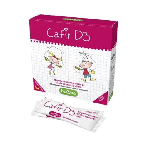 Ogni bustina di Buona Cafir D3 è formulata per fornire un apporto nutrizionale equilibrato e mirato. In particolare, ogni bustina contiene: Latte fermentato 150 mg, che apporta probiotici e peptidi bioattivi; Vitamina D3 15 mcg (pari a 600 UI), una quantità adeguata per supportare l'assorbimento del calcio e la funzione del sistema immunitario; Calcio 400 mg, un minerale essenziale per la formazione e il mantenimento di ossa e denti sani. Questi valori nutrizionali sono attentamente calibrati per soddisfare le esigenze dei bambini in fase di crescita, contribuendo al loro benessere generale e supportando la normale crescita e lo sviluppo osseo. L'assunzione regolare di questo integratore, nel contesto di una dieta varia ed equilibrata, può aiutare a prevenire carenze nutrizionali e a garantire un adeguato apporto di nutrienti essenziali per la salute dei bambini.