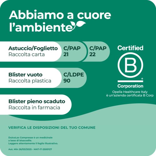 Avvertenze Come tutti i lassativi, Dulcolax non deve essere assunto in modo continuo ogni giorno o per lunghi periodi di tempo senza indagare sulla causa della stitichezza. In caso di diabete mellito, ipertensione o cardiopatia usare solo dopo aver consultato il medico. L’abuso di lassativi (uso frequente o prolungato o con dosi eccessive) può causare diarrea persistente con conseguente perdita di acqua, sali minerali (specialmente potassio) e altri fattori nutritivi essenziali. Nei casi più gravi è possibile l’insorgenza di disidratazione o ipopotassiemia la quale può determinare disfunzioni cardiache o neuromuscolari, specialmente in caso di contemporaneo trattamento con glicosidi cardiaci, diuretici o corticosteroidi. La perdita intestinale di liquidi può provocare disidratazione. I sintomi possono essere sete e oliguria. Nei pazienti, per i quali la disidratazione può essere pericolosa (pazienti con insufficienza renale, pazienti anziani), il trattamento con Dulcolax deve essere interrotto e ripreso solo sotto la supervisione del medico. Nei pazienti può verificarsi ematochezia (sangue nelle feci), che è generalmente lieve e scompare da sola. L’abuso di lassativi, specialmente quelli di contatto (lassativi stimolanti), può causare dipendenza (e, quindi, possibile necessità di aumentare progressivamente il dosaggio), stitichezza cronica e perdita delle normali funzioni intestinali (atonia intestinale). Sono stati riportati casi di vertigini e/o sincope dopo assunzione di Dulcolax. I dati relativi a questi casi suggeriscono che gli eventi, più che un fenomeno correlato all’assunzione di Dulcolax, potrebbero essere interpretati come manifestazione di "sincope da defecazione" (attribuibile allo sforzo dell’atto della defecazione), oppure come una risposta vasovagale al dolore addominale correlato alla costipazione stessa. L’uso delle supposte può portare a sensazioni dolorose e irritazione locale, in particolare, nei pazienti con ragadi e proctite ulcerativa (vedere sezione 4.3 "controindicazioni"). Informazioni importanti su alcuni eccipienti: Dulcolax compresse contengono 33,2 mg di lattosio pari a 66,42 mg in caso di assunzione della dose massima giornaliera, per il trattamento della costipazione negli adulti e negli adolescenti di età superiore ai 10 anni. I pazienti affetti da rari problemi ereditari di intolleranza al galattosio, da deficit di lattasi di Lapp o malassorbimento di glucosio–galattosio, non devono assumere le compresse di questo medicinale. Dulcolax compresse contengono 23,4 mg di saccarosio pari a 46,8 mg in caso di assunzione della dose massima giornaliera per il trattamento della costipazione negli adulti e negli adolescenti di età superiore ai 10 anni. I pazienti affetti da rari problemi ereditari di intolleranza al fruttosio, da malassorbimento di glucosio–galattosio, o da deficit di sucrasi–isomaltasi, non devono assumere le compresse di questo medicinale. Dulcolax compresse può causare disturbi gastrici e diarrea. Precauzioni di impiego Nei bambini di età compresa fra 2 anni e 10 anni il medicinale può essere usato solo dopo aver consultato il medico (vedere paragrafo 4.3). Come tutti i lassativi non deve essere preso giornalmente o per periodi prolungati senza aver prima valutato la causa della stitichezza. Il trattamento della stitichezza cronica o ricorrente richiede sempre l’intervento del medico per la diagnosi, la prescrizione dei farmaci e la sorveglianza nel corso della terapia. Consultare il medico quando la necessità del lassativo deriva da un improvviso cambiamento delle precedenti abitudini intestinali (frequenza e caratteristiche delle evacuazioni) che duri da più di due settimane o quando l’uso del lassativo non riesce a produrre effetti. È inoltre opportuno che i soggetti anziani o in non buone condizioni di salute consultino il medico prima di usare il medicinale.