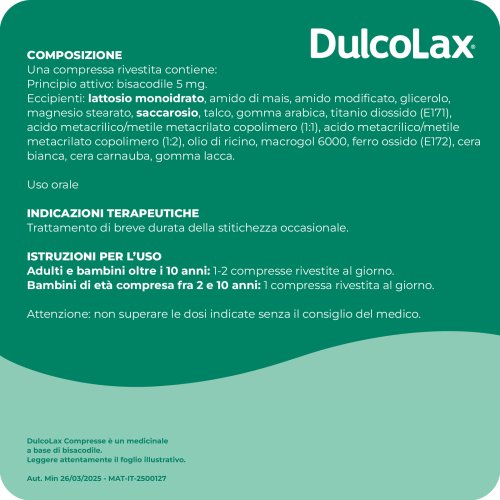 COMPRESSE RIVESTITE – Adulti: 1–2 compresse rivestite al giorno. Popolazione pediatrica – Bambini oltre i 10 anni: 1–2 compresse rivestite al giorno. – Bambini di età compresa fra 2 e 10 anni: 1 compressa rivestita al giorno. È consigliabile iniziare con la dose minima prevista. La dose può essere poi aumentata,fino alla dose massima raccomandata, per una regolare evacuazione delle feci. La dose massima giornaliera non deve essere mai superata. Istruzioni per l’uso Assumere le compresse rivestite preferibilmente la sera per determinare un’evacuazione la mattina seguente (dopo circa 10 ore). Con la somministrazione al mattino, a digiuno, l’effetto si ottiene dopo cinque ore circa. Le compresse rivestite non devono essere somministrate insieme a prodotti che riducono l’acidità del tratto gastrointestinale superiore, quali latte, antiacidi (per esempio bicarbonato) o inibitori della pompa protonica. Le compresse rivestite vanno deglutite intere. Ingerire insieme ad una adeguata quantità di acqua (un bicchiere abbondante). Una dieta ricca di liquidi favorisce l’effetto del medicinale. SUPPOSTE – Adulti: 1 supposta adulti (10 mg) al giorno. Popolazione pediatrica – Bambini oltre i 10 anni: 1 supposta adulti (10 mg) al giorno. – Bambini di età compresa fra 2 e 10 anni: 1 supposta bambini (5 mg) al giorno. La dose massima giornaliera non deve essere mai superata. I bambini di età pari o inferiore ai 10 anni con stitichezza cronica o persistente devono assumere Dulcolax sotto la supervisione del medico. Dulcolax non deve essere somministrato nei bambini di età inferiore ai due anni. Istruzioni per l’uso L’effetto delle supposte si manifesta di solito in circa 20 minuti (range: 10 – 30 minuti). Non superare le dosi consigliate. I lassativi devono essere usati il meno frequentemente possibile e per non più di sette giorni. L’uso per periodi di tempo maggiori richiede la prescrizione del medico dopo adeguata valutazione del singolo caso.