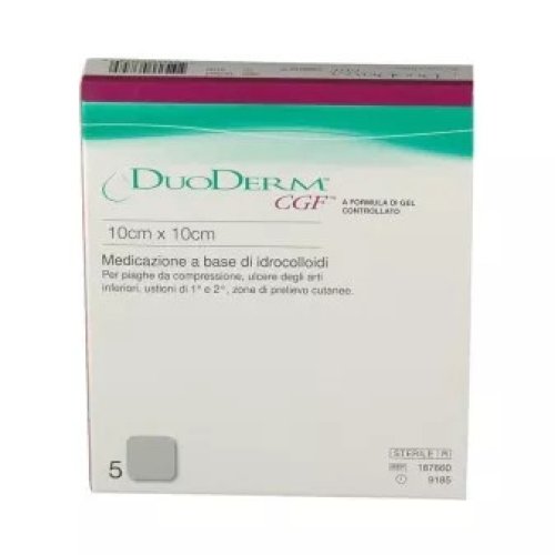 Duoderm CGF è una medicazione idrocolloidale sterile progettata per favorire la guarigione di lesioni cutanee con livelli di essudato da scarso a moderato. Questo prodotto è particolarmente indicato per l'utilizzo su lesioni a spessore totale o parziale, offrendo un ambiente ottimale per la riparazione dei tessuti.