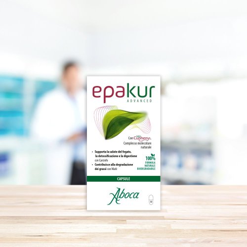 Integratore alimentare con Neocuphenyl, innovativo complesso molecolare composto da acidi idrossicinnamici, terpeni e flavonoidi che derivano da carciofo, rosmarino, matè e biancospino. Epakur Advanced contribuisce al mantenimento della salute del fegato grazie all'estratto di carciofo, utile anche per supportare la detossificazione. La formulazione è stata arricchita dall'estratto di rosmarino che supporta la normale funzionalità del fegato e la funzione biliare e, in sinergia con quello di carciofo, facilita la digestione. Completa la formulazione l'estratto di matè che, intervenendo sul metabolismo dei grassi, contribuisce alla loro degradazione. Inoltre il prodotto svolge un'azione antiossidante grazie all'associazione degli estratti di biancospino, carciofo, rosmarino e matè. Epakur Advanced è un integratore alimentare naturale e biodegradabile al 100%, non contiene sostanze di sintesi, emi-sintesi o geneticamente modificate.
