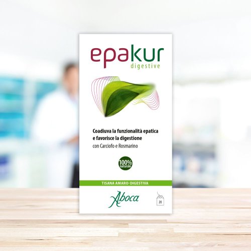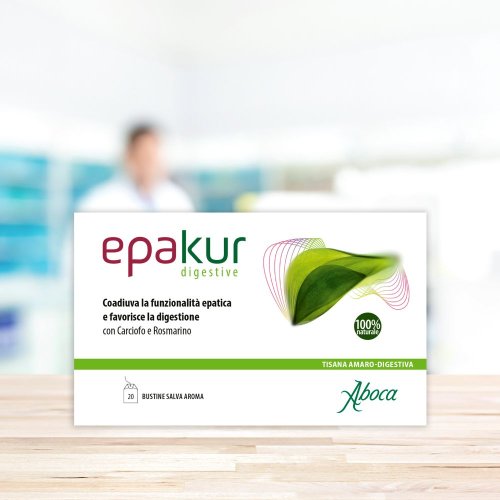 Integratore alimentare. Epakur digestive tisana è indicato per coadiuvare la funzionalità epatica e favorire la digestione grazie alla presenza di carciofo e rosmarino che, con le loro proprietà amaro-digestive, rendono la tisana particolarmente indicata nel dopo pasto. Inoltre la presenza del carciofo supporta la detossificazione dell'organismo mentre il rosmarino è utile per il mantenimento delle fisiologiche funzioni depurative. Completano la formulazione la vite rossa ad azione antiossidante e il rooibos. Infine la presenza di menta piperita e liquirizia rende l'infuso gradevole anche senza zucchero. Epakur digestive è un integratore alimentare naturale e biodegradabile al 100%, non contiene sostanze di sintesi, emi-sintesi o geneticamente modificate.