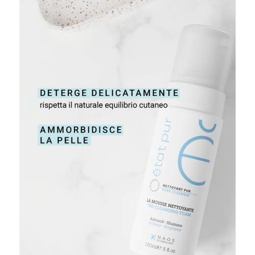 Etat Pur Mousse Detergente Delicata deterge il viso delicatamente, rimuovendo immediatamente le impurità quotidiane.