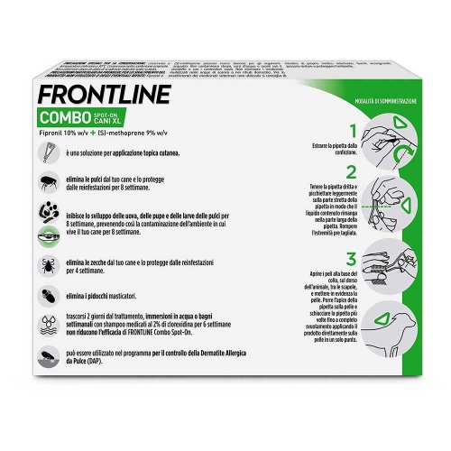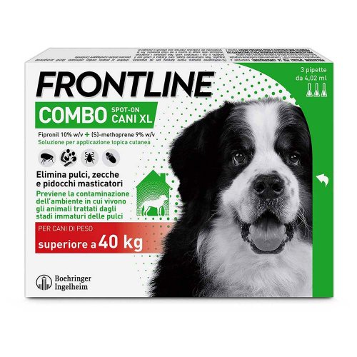 Frontline Combo Cani è un antiparassitario per cani in pratiche pipette per cani oltre i 40 kg, capaci di agire contro zecche, pidocchi masticatori, pulci adulte e uova di pulci, prevenendo anche la contaminazione della casa.