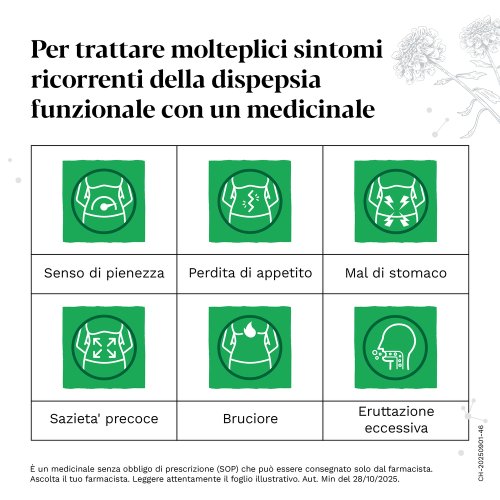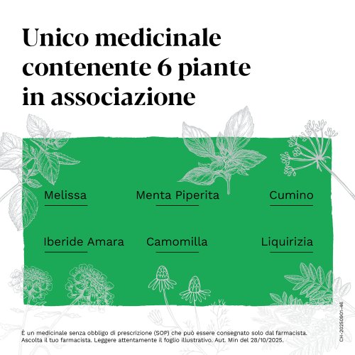 Grazie alla combinazione di 6 piante medicinali svolge azione lenitiva, antinfiammatoria e protettiva a livello gastrointestinale così da alleviare i sintomi da dispepsia funzionale.