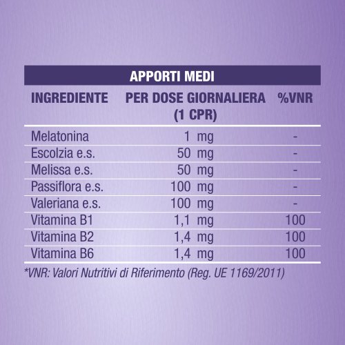 Le sue proprietà rilassanti sono dovute alla presenza di uno speciale complesso a base di Camomilla, Valeriana, Ashwagandha, Melissa e Lavanda che agiscono in sinergia con Melatonina, così da distendere il corpo e la mente, favorendo un rapido addormentamento.