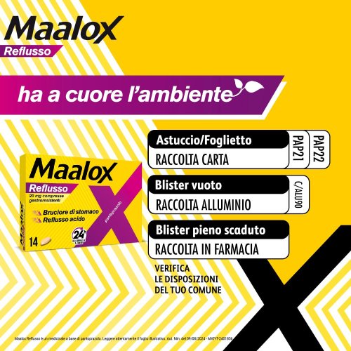 Posologia La dose raccomandata è 20 mg di pantoprazolo (una compressa) al giorno. Potrebbe essere necessario assumere le compresse per 2–3 giorni consecutivi per ottenere un miglioramento dei sintomi. Una volta raggiunta la completa guarigione dei sintomi, il trattamento deve essere sospeso. Il trattamento non deve superare 4 settimane senza consultare un medico. Se entro 2 settimane di trattamento continuo non si nota alcun miglioramento dei sintomi, il paziente deve rivolgersi al medico. Popolazioni particolari Non è necessario l’aggiustamento della dose in pazienti anziani o in pazienti con compromissione renale o epatica. Popolazione pediatrica L’uso di MAALOX REFLUSSO non è raccomandato nei bambini e adolescenti al di sotto di 18 anni a causa della insufficienza di dati sulla sicurezza e sull’efficacia. Modo di somministrazione Le compresse gastroresistenti di MAALOX REFLUSSO 20 mg non devono essere masticate o frantumate, e devono essere deglutite intere con del liquido prima del pasto.