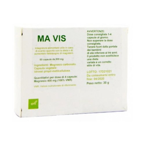 Oti Ma Vis 60 Capsule è un integratore alimentare formulato per fornire un supporto nutrizionale in caso di aumentato fabbisogno o diminuito apporto di magnesio. Questo prodotto è progettato per contribuire al benessere generale dell'organismo, agendo su diverse funzioni fisiologiche che dipendono da un adeguato livello di magnesio. La sua formulazione in capsule rende l'assunzione semplice e comoda, integrandosi facilmente nella routine quotidiana. La composizione di Ma Vis si basa su ingredienti selezionati per garantire un'alta biodisponibilità e un'efficace azione sul metabolismo.
