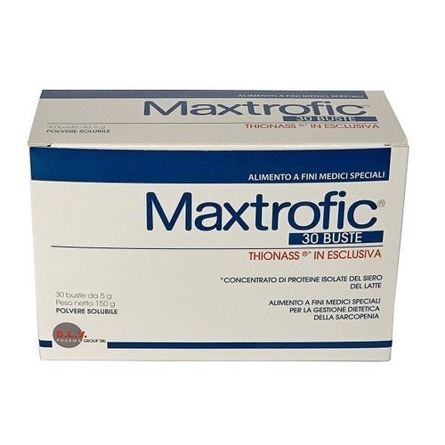 MAXTROFIC è un alimento a fini medici speciali iperproteico, formulato per supportare la gestione dietetica della sarcopenia. Questo prodotto è composto da proteine del siero di latte non denaturate, caratterizzate da un elevato valore biologico grazie alla formula THIONASS. La sua composizione specifica lo rende particolarmente indicato per soggetti che necessitano di un apporto nutrizionale mirato per contrastare la perdita di massa muscolare scheletrica, una condizione spesso associata all'invecchiamento o a particolari stati patologici. La formulazione di MAXTROFIC è studiata per fornire un supporto nutrizionale completo e bilanciato, contribuendo al mantenimento della salute muscolare e al benessere generale. Ogni confezione contiene 30 bustine, facilitando l'assunzione e la gestione della dose giornaliera raccomandata.