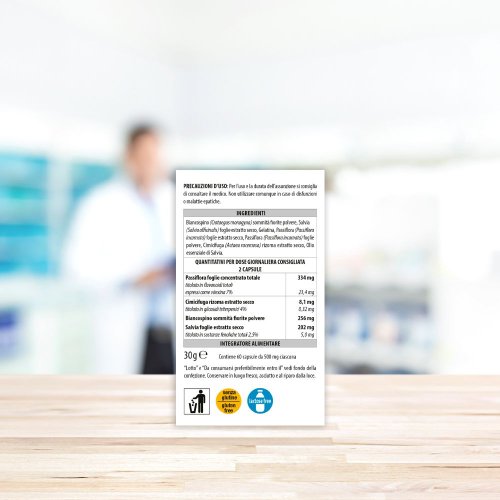 Biancospino (Crataegus monogyna) sommità fiorite polvere, salvia (Salvia officinalis) foglie estratto secco, gelatina, passiflora (Passiflora incarnata) foglie estratto secco, passiflora (Passiflora incarnata) foglie polvere, cimicifuga (Actaea racemosa) rizoma estratto secco, olio essenziale di salvia.