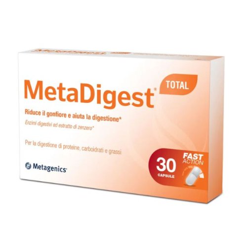 Integratore di enzimi per favorire la digestione di proteine, carboidrati e grassi. MetaDigest Total è un integratore a base di enzimi digestivi di origine non animale e quindi adatto anche a consumatori vegetariani o vegani. Esso contiene una miscela bilanciata di enzimi per la digestione delle proteine, dei grassi e dei carboidrati normalmente presenti in un pasto completo. La presenza di lecitina aiuta ad emulsionare i grassi e la presenza di fitasi favorisce la degradazione dei fitati presenti in una dieta ricca di vegetali che possono contrastare l'assorbimento di alcuni micronutienti. Gli enzimi di MetaDigest total funzionano indipendentemente dal pH e quindi già nello stomaco. La formulazione di MetaDigest total contiene anche estratto secco di zenzero in grado di supportare la funzione digestiva.