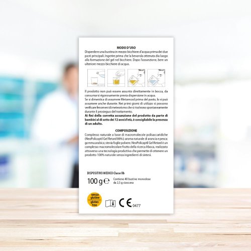 Complesso a base di macromolecole polisaccaridiche (NeoPolicaptil Gel Retard, 86%); aroma naturale di arancia e pesca; gomma arabica; stevia foglie polvere.