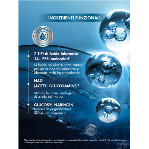 Arricchito con 14+ diversi pesi molecolari di Acido Ialuronico, si fonde nei diversi strati della pelle, donando elasticità, compattezza e turgore, per un'azione multi-layer profonda.