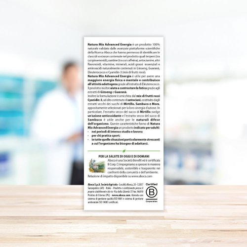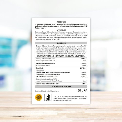 Integratore alimentare a base di ginseng, guaranà, eleuterococco e Cyanidin-3 (mix di frutti rossi), utile per avere una maggiore energia fisica e mentale, contribuire all’attività adattogena, svolgere un'azione antiossidante e per le naturali difese dell'organismo. Indicato durante i periodi di intenso studio e lavoro e per chi pratica sport.