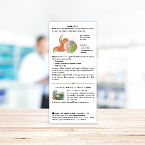 NeoBianacid forma sulla mucosa un film ad effetto barriera, che la protegge dal contatto con i succhi gastrici e le sostanze irritanti. NeoBianacid contiene Poliprotect, un complesso molecolare frutto della ricerca Aboca che, grazie alle sue proprietà muco?adesive, riproduce l'attività protettiva del muco fisiologico. Poliprotect agisce grazie alla sinergia tra la componente polisaccaridica (peso molecolare >20.000 dalton), dotata di alta affinità per la mucosa, e la componente minerale (Limestone e Nahcolite). Completano l'azione di Poliprotect le proprietà antiossidanti della componente flavonoidica che contrasta l'irritazione dovuta ai radicali liberi. NeoBianacid è indicato per il trattamento delle problematiche connesse all'acidità, quali bruciore, dolore, reflusso gastroesofageo e gastrite. È indicato anche nel trattamento dei sintomi associati a dispepsia (difficoltà di digestione), quali bruciore, pesantezza e meteorismo. NeoBianacid può essere utile in prevenzione, nelle situazioni che possono indurre irritazioni della mucosa (assunzione di farmaci antinfiammatori/antidolorifici non steroidei, periodi di stress psico-fisico, cambi di stagione, alimentazione e stili di vita scorretti). Il prodotto è adatto anche all'uso in gravidanza, durante l'allattamento e nei bambini sopra i 6 anni.