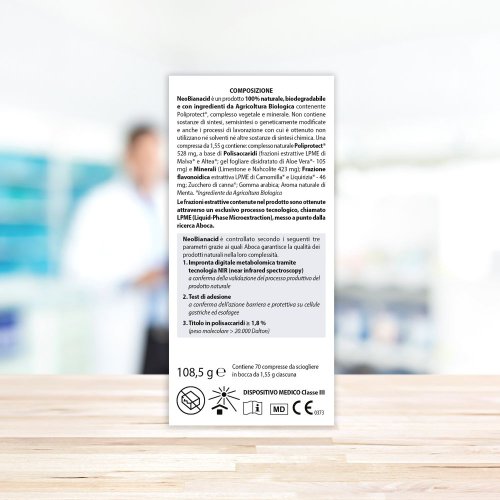 NeoBianacid è un dispositivo medico a base di complessi molecolari vegetali e minerali, che svolge un'azione protettiva e lenitiva della mucosa gastroesofagea utile per contrastare rapidamente il bruciore, il dolore, la sensazione di acidità, ovvero i sintomi tipici dell'irritazione e dell'infiammazione della mucosa stessa. NeoBianacid è un prodotto 100% naturale, biologico, senza glutine e dal gusto gradevole.