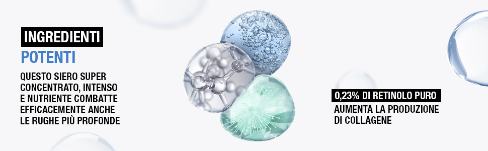 Grazie alla presenza di Retinolo puro, aumenta la produzione di collagene e promuove il rinnovamento delle cellule cutanee così da rimpolpare le rughe, ridurre le macchie scure e quelle legate all'età e ravvivare la luminosità dell'incarnato.