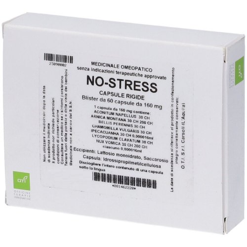 No Stress Composto è un farmaco omeopatico progettato per supportare il benessere psico-fisico in situazioni di stress e affaticamento. La sua formula, realizzata da OTI, è pensata per affrontare le somatizzazioni dello stress, come nausea, cefalea e dolori generalizzati. Questo prodotto si presenta in capsule, facilitandone l'assunzione e l'integrazione nella routine quotidiana.