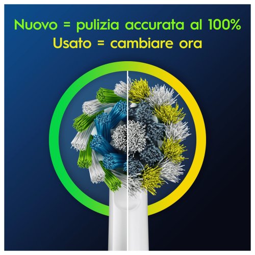 Le testine Oral-B Pro CrossAction sono dotate di un pratico indicatore di utilizzo che ti aiuta a monitorare lo stato delle setole e a sapere quando è il momento di sostituire la testina. Le setole dell'indicatore sono colorate di verde quando la testina è nuova, ma gradualmente sbiadiscono e diventano gialle con l'uso. Quando le setole hanno perso la maggior parte del loro colore verde, è il momento di sostituire la testina per garantire una pulizia sempre efficace. Questo sistema ti permette di non dover indovinare quando è il momento di cambiare la testina, ma di avere un'indicazione chiara e precisa basata sull'effettivo stato delle setole.