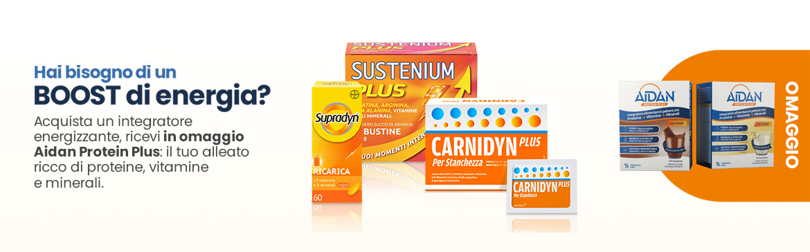 Acquista un integratore energizzante e ricevi in omaggio una confezione da 7 Bustine di Aidan Protein Plus, il tuo alleato ricco di proteine, vitamine e minerali. La sua formulazione è pensata per unire nutrimento, energia e sostegno metabolico, risultando quindi ideale in combinazione con integratori energizzanti o come complemento alla dieta di chi ha un fabbisogno proteico maggiore.