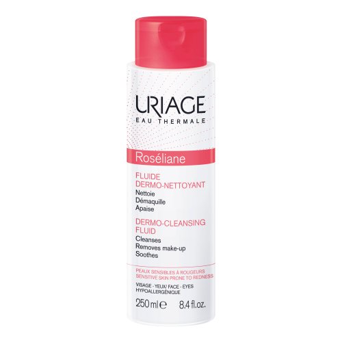 DERMO-NETTOYANT Il Fluido Dermo-Detergente Roséliane elimina tutte le impurità. Grazie alla sua elevata tollerabilità è indicato per la cute sensibile soggetta a rossori. Gradevolmente profumato, questo fluido dona alla cute purezza, freschezza e benessere immediato. Il fluido rimuove il trucco da viso e occhi senza bisogno di sciacquare. Arricchito con l'Acqua Termale Uriage, questo fluido detergente lascia la pelle morbida e fresca grazie all'azione combinata di diversi estratti vegetali rigorosamente selezionati.