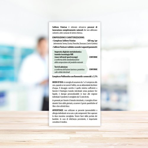 1 compressa contiene: 420 mg di Complesso Sollievo Fisiolax ottenuto da Senna, Cicoria, Finocchio, Tarassaco, Carvi e Cumino.
