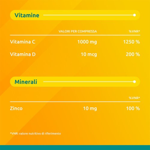 1 compressa effervescente contiene: 1000 mg di Vitamina C; 10 mcg di Vitamina D; 10 mg di Zinco.