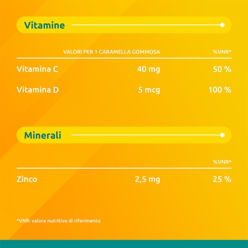 Sciroppo di glucosio, zucchero, gelatina, acido ascorbico, regolatore di acidità:acido citrico anidro, zinco solfato, maltodestrine, aroma: arancio, fragola, papaya,agente di rivestimento: cera d'api, cera di carnauba, olio di palma, colecalciferolo,colorante: E100, E120.