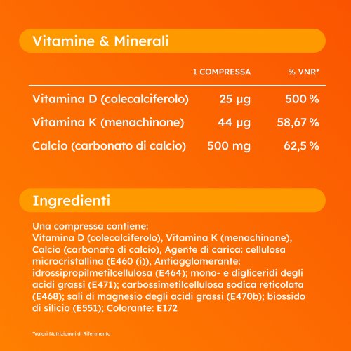 Calcio (carbonato di calcio); agente di carica: cellulosa microcristallina (E460i); agenti antiagglomeranti: idrossipropilmetilcellulosa (E464), mono e digliceridi degli acidi grassi (E471), carbossimetilcellulosa sodica reticolata (E468), sali di magnesio degli acidi grassi (E470b), biossido di silicio (E551); vitamina D (colecalciferolo), vitamina K (menachinone); colorante: E172.