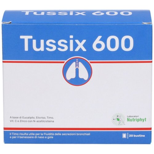 Ogni bustina di Tussix 600 contiene: N-acetilcisteina 600 mg, Vitamina C 600 mg (750% VNR*), Zinco 10 mg (100% VNR*), Eucalipto 50 mg, Elicriso 50 mg, Timo 50 mg. Questi valori nutrizionali sono stati studiati per fornire un apporto ottimale di nutrienti essenziali per il benessere delle vie respiratorie e il supporto del sistema immunitario. La presenza di vitamina C e zinco contribuisce a rafforzare le difese naturali dell'organismo, mentre gli estratti di eucalipto, elicriso e timo offrono un'azione balsamica e fluidificante sulle vie respiratorie. La N-acetilcisteina, con la sua azione antiossidante e fluidificante, aiuta a proteggere le cellule dai danni dei radicali liberi e a liberare le vie respiratorie dal muco in eccesso.