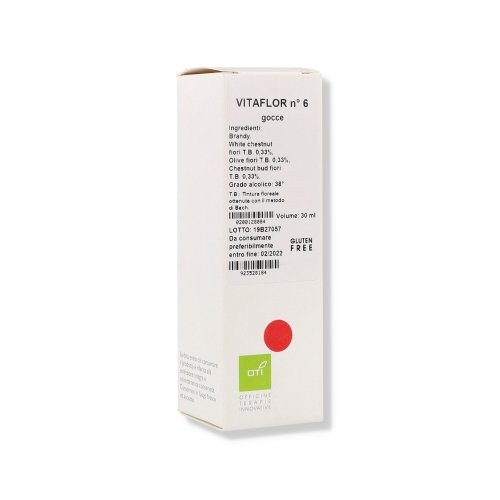 La composizione di Otis Vitaflor N 6 Gocce include Brandy come base, insieme a una combinazione di fiori di Bach accuratamente selezionati. Tra questi, troviamo White Chestnut fiori T.B. (0,33%), noto per le sue proprietà calmanti e per la capacità di liberare la mente dai pensieri ricorrenti. Olive fiori T.B. (0,33%) è incluso per il suo effetto rivitalizzante, utile per contrastare la stanchezza fisica e mentale. Infine, Chestnut bud fiori T.B. (0,33%) supporta l'apprendimento e aiuta a superare le difficoltà derivanti da esperienze passate.
