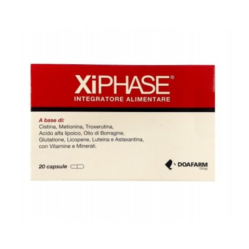 Gli ingredienti di XIPHASE includono: Agente di carica: Cellulosa microcristallina; L-Cistina, Gelatina alimentare, Vitamina C (Acido L-Ascorbico), L-Metionina, Troxerutina, Vitamina E (dl-alfa-tocoferilacetato), Olio di borragine polvere (Borago officinalis L. semi, Biossido di silicio), Acido alfalipoico, Agenti antiagglomeranti: Biossido di silicio, sali di Magnesio degli acidi grassi; Zinco ossido, L-Glutatione ridotto, Niacina (Nicotinamide), Rame gluconato, Lycobeads - Licopene al 5% da Pomodoro frutto estr. sec. (Solanum lycopersicum L., Alginato, Amido di piselli, gomma arabica), Calcio pantotenato, Vitamina B6 (Piridossina cloridrato), Lyco-lutein® (Luteina al 20%, Alginati, Gomma arabica, Amido di Piselli, estratto di Rosmarino), Biotina, Alga Haematococcus pluvialis al 5% in astaxantina (biossido di silicio, lecitina di soia, ascorbil palmitato, dl-alfa-tocoferolo), Colorante: Titanio biossido. Ogni componente è stato selezionato per le sue specifiche proprietà e per il suo contributo al benessere della pelle. La cellulosa microcristallina funge da agente di carica, assicurando la consistenza della capsula. Le vitamine C ed E sono potenti antiossidanti che proteggono la pelle dai danni dei radicali liberi. Lo zinco e il rame sono minerali essenziali per la salute della pelle, mentre il licopene, la luteina e l'astaxantina sono carotenoidi con proprietà antiossidanti e protettive. L'olio di borragine fornisce acidi grassi essenziali che aiutano a mantenere l'idratazione e l'elasticità della pelle. La L-cistina e la L-metionina sono aminoacidi che supportano la sintesi della cheratina, una proteina fondamentale per la struttura della pelle, dei capelli e delle unghie.